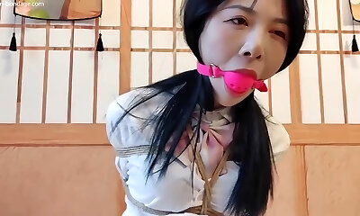 Ball-gagged Asian hoe Yui Tachiki gets roped up and masturbated hard a bit