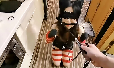 Thin white masked bitch with bound boobies humiliated
